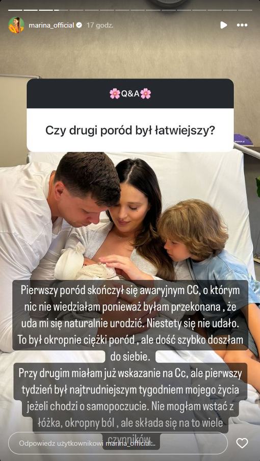 Podczas ciąży z córeczką Marina dostała już wskazanie na wykonanie cesarskiego cięcia. Dużo gorzej czuła się jednak w pierwszych dniach po zabiegu.