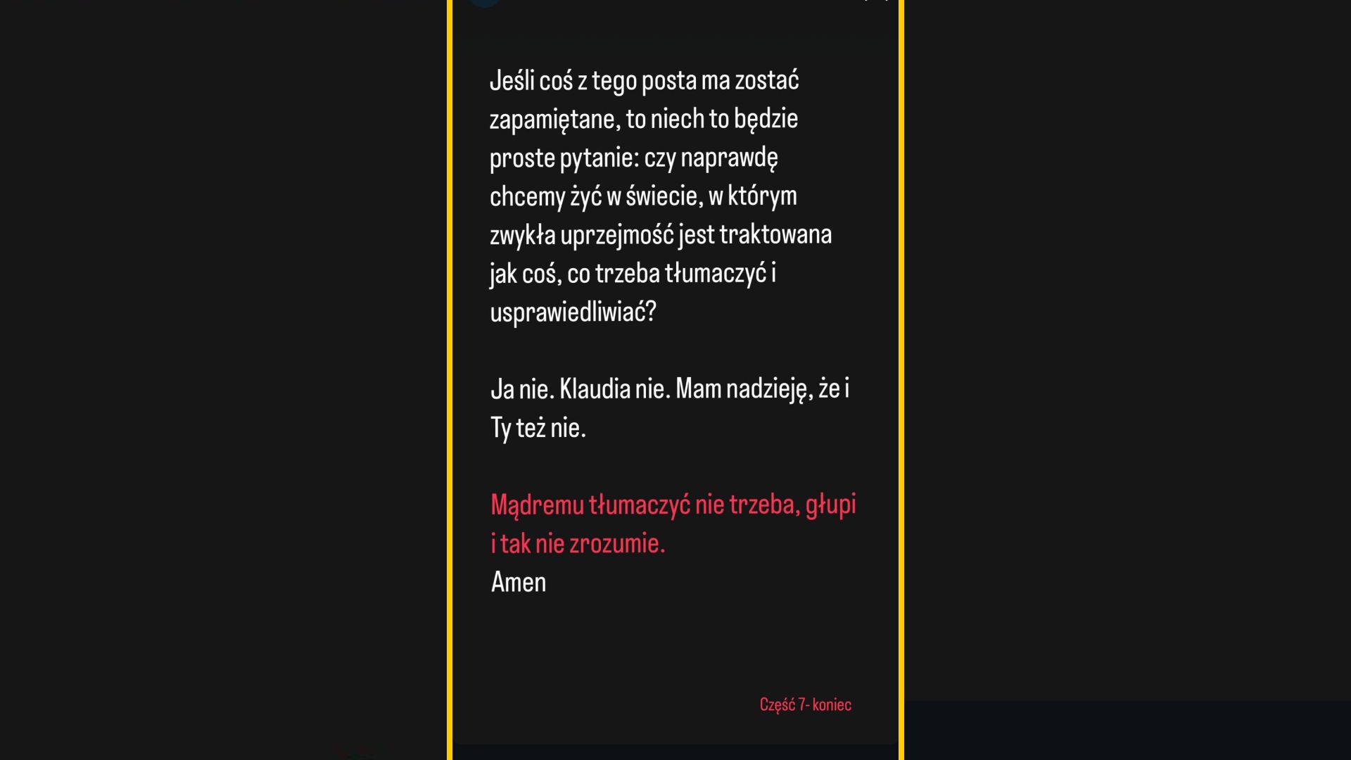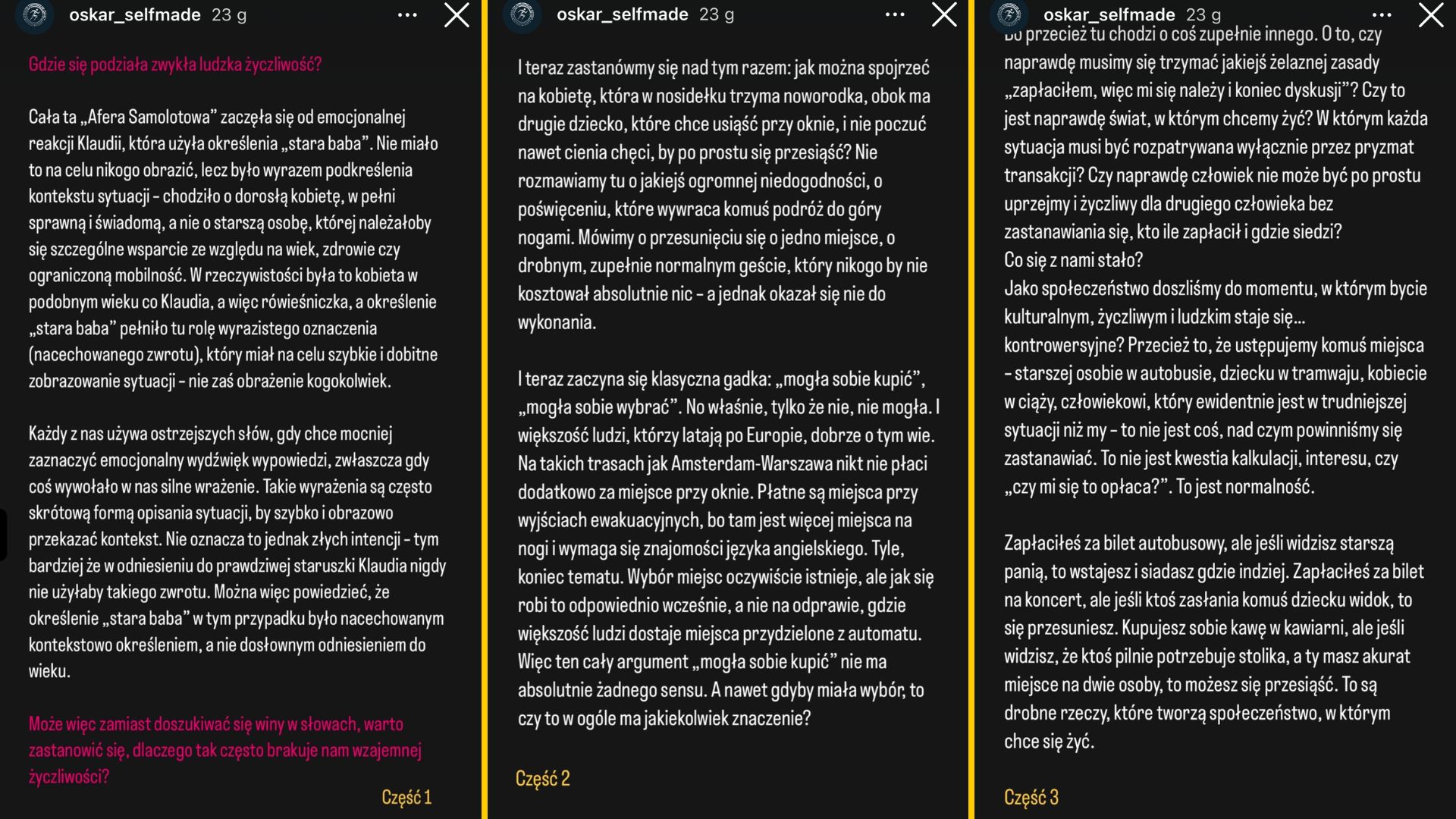W obszernym wpisie przekonywał, że gest ustąpienia miejsca byłby „drobny” i „nic nie kosztował”, podkreślając, że świat staje się coraz bardziej bezduszny.