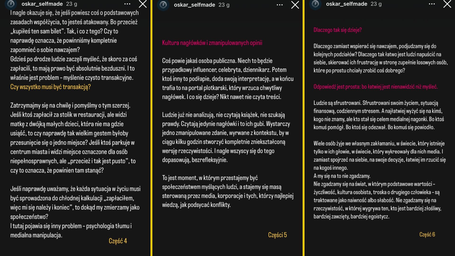 Okazuje się, że jeśli powiesz coś o podstawowych zasadach współżycia, to jesteś atakowany. Bo przecież „kupiłeś ten sam bilet”. Tak, i co z tego? Czy to naprawdę oznacza, że powinniśmy kompletnie zapomnieć o sobie nawzajem? Gdzieś po drodze ludzie zaczęli myśleć, że skoro za coś zapłacili, to mają prawo być absolutnie bezduszni. I to właśnie jest problem — myślenie czysto transakcyjne. Czy wszystko musi być transakcją?