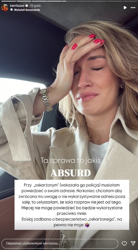 Od momentu udziału Kamili w „RszŻ” minęło już kilka lat. Przez ten czas Boś zyskała niemałą rozpoznawalność: także w mediach społecznościowych. Dziś jej profil na Instagramie śledzi już blisko 200 tysięcy użytkowników sieci. To właśnie z nimi bohaterka „Rolnika…” podzieliła się ostatnio przykrym doświadczeniem. Okazało się, że kobieta musiała stawić czoła dość nieprzyjemnej sytuacji. Otrzymywała przez dłuższy czas niepokojące wiadomości od pewnego mężczyzny. Sprawa została zgłoszona na policję, a ostatnio odbyła się rozprawa w sądzie. Finał spotkania negatywnie zaskoczył jednak Boś, która na Instagramie nie kryła emocji. W pewnym momencie w jej oczach pojawiły się łzy.