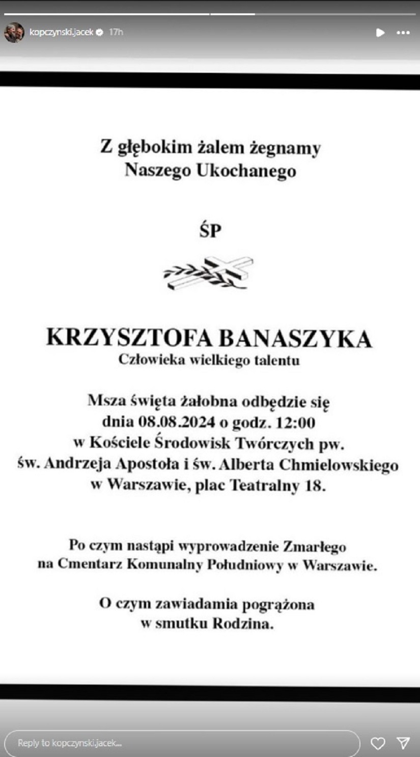 Nekrolog pojawił się na jednej z instagramowych relacji Kopczyńskiego.