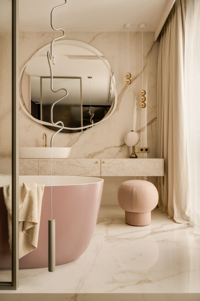 Poza tym apartament zdobią dzieła sztuki, które powstawały równolegle z projektem wnętrz. Od rzeźby Krzysztofa Renesa w holu, przez artystyczną tkaninę Sienny Palomy w salonie, aż po obrazy i tekstylia w innych pomieszczeniach – każdy element został stworzony z myślą o tej konkretnej przestrzeni, by nadać jej niepowtarzalny charakter.