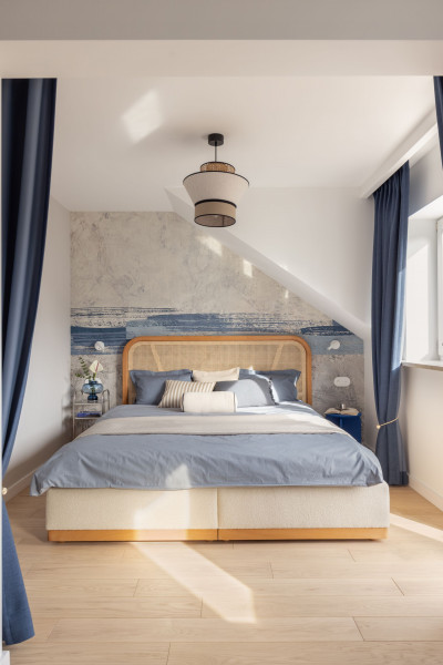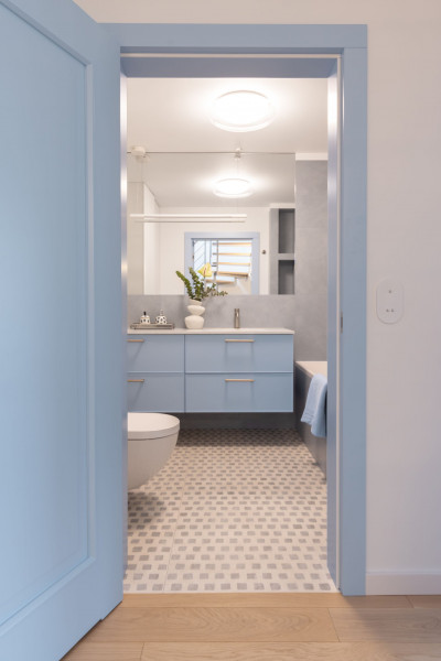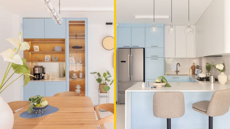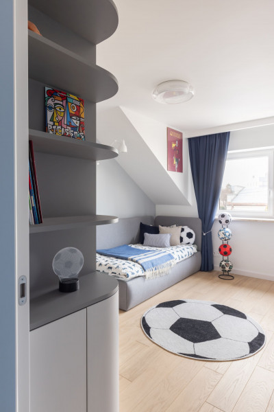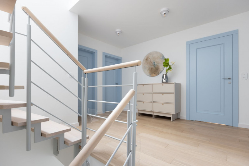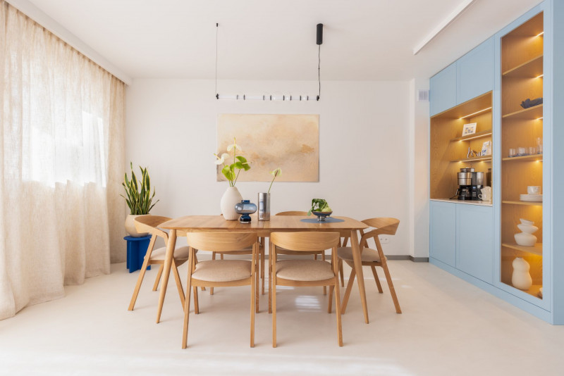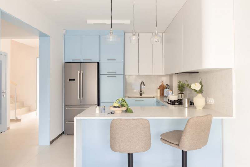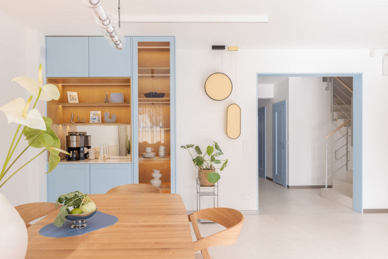 Zgodnie z życzeniem inwestorów ich dom miał być jasny, spójny i muśnięty nutą koloru. Inspiracją stał się wyjątkowy odcień błękitu – podobny do koloru oczu właścicielki, który konsekwentnie pojawia się w zabudowie stolarskiej, drzwiach czy detalach wykończeniowych, sprawiając, że całość nabiera wyjątkowo indywidualnego charakteru.