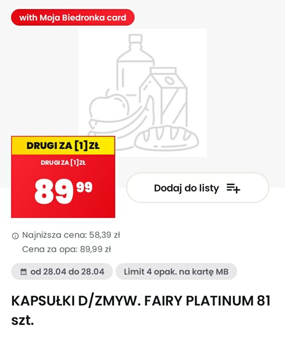 Z aplikacją lub kartą można liczyć też na dużą oszczędność na całej marce Fairy. Ofertą z drugim, tańszym produktem za 1 zł objęto zarówno płyny do mycia naczyń, które regularnie kosztują 14,99 zł, jak i droższe kapsułki do zmywarki, np. Platinum, 81 szt., za które normalnie trzeba zapłacić 89,99 zł. Warto aktualnie uzupełnić zapasy, bo jeśli np. weźmie się dwa opakowania takich właśnie kapsułek, to całość wyjdzie za niespełna 91 zł, podczas gdy poza promocją trzeba by zapłacić blisko 180 zł. Tu limit to maksymalnie dwie rzeczy za symboliczną złotówkę na konto klienta.