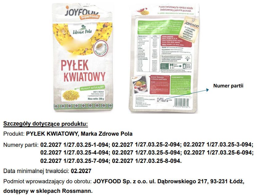 Drugi wycofywany artykuł to pyłek kwiatowy marki Zdrowe Pola. Decyzja dotyczy ośmiu partii z datą minimalnej trwałości do lutego 2027 roku, w których badania Państwowej Inspekcji Sanitarnej wykazały przekroczenie dopuszczalnego poziomu alkaloidów pirolizydynowych. „Zgodnie z oceną ryzyka ekspertów Narodowego Instytutu Zdrowia Publicznego PZH – Państwowego Instytutu Badawczego spożycie produktu zanieczyszczonego alkaloidami pirolizydynowymi na poziomie wykrytym w badaniu urzędowym może stanowić zagrożenie dla zdrowia konsumentów” – podkreślono.