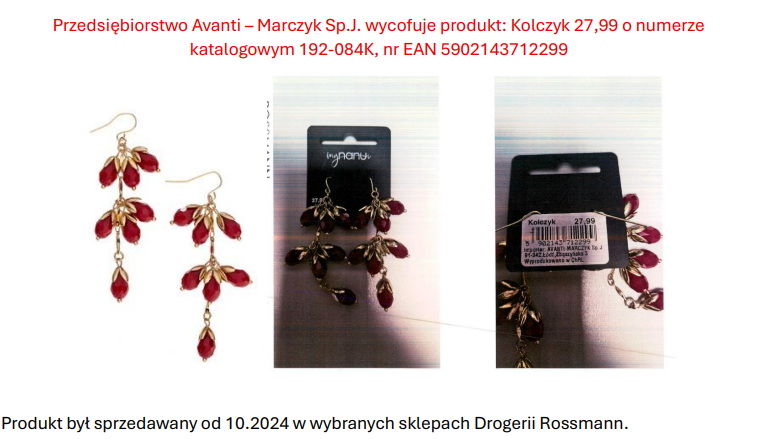 Pierwszy produkt to kolczyki marki My Nanu, sprzedawane w wybranych drogeriach Rossmann od października 2024 roku w cenie 27,99 zł. „W toku przeprowadzonych badań wykazano niezgodność niektórych elementów kolczyka pod względem zawartości szkodliwego metalu – kadmu, przekraczającej normy zgodnie z rozporządzeniem REACH” – uzasadniono.